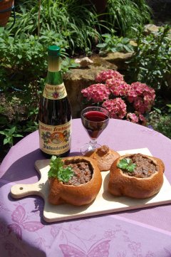 Holunder-Rindsgulasch in Roggenbrot-Tassen.